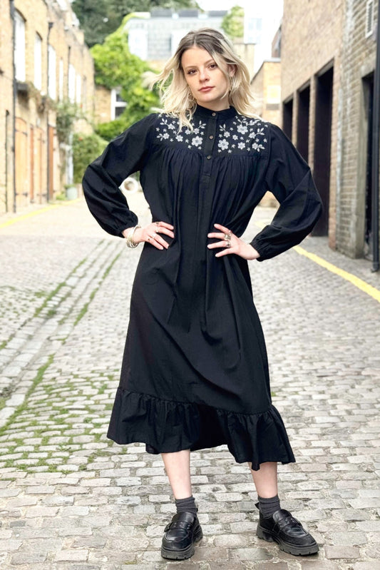 Yuka Yoke Frill Dress with Hand Embroidery - Black