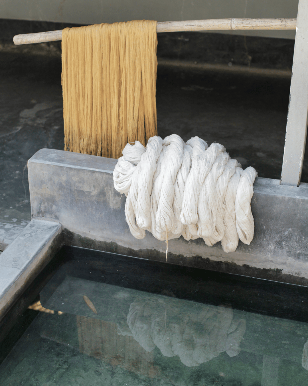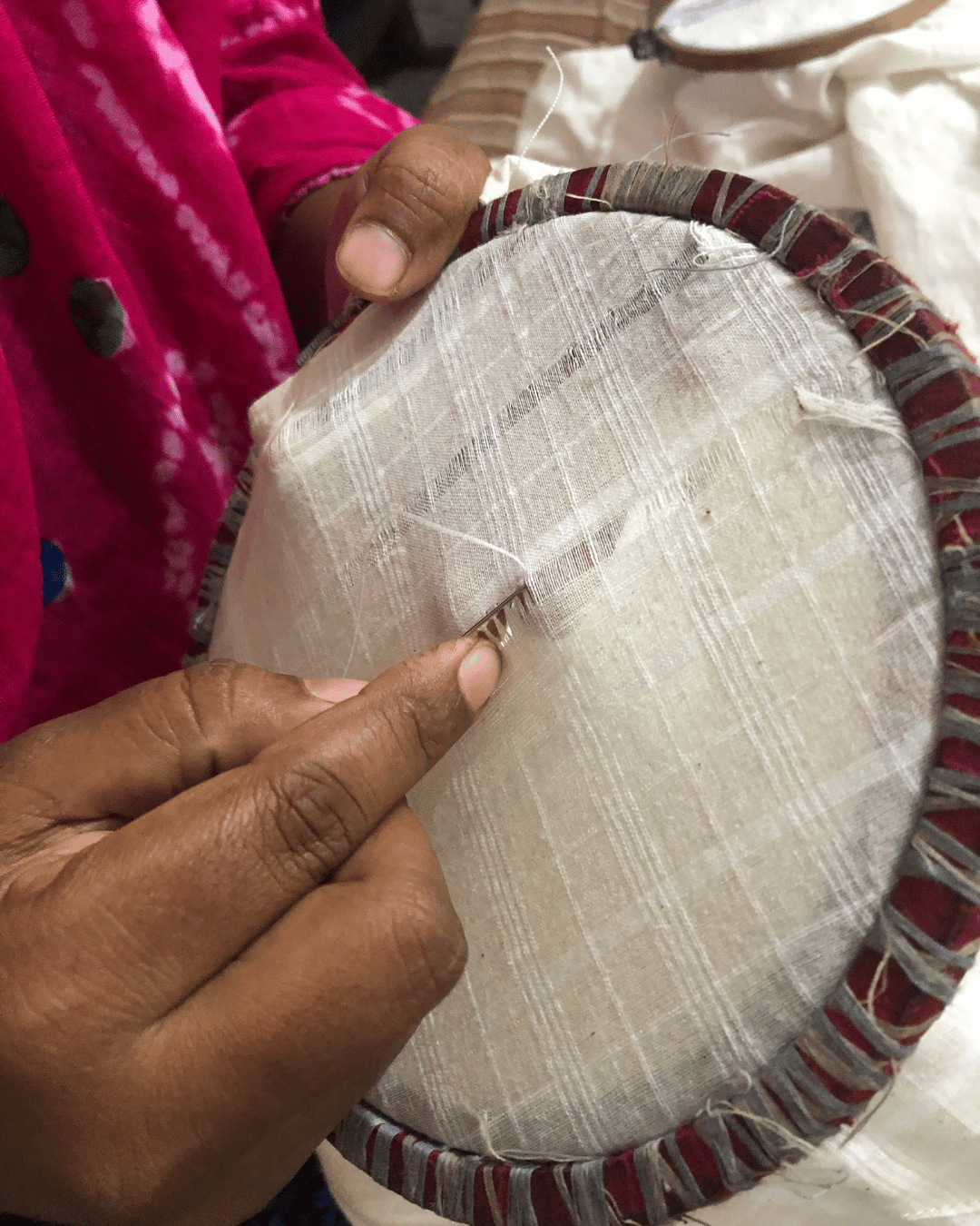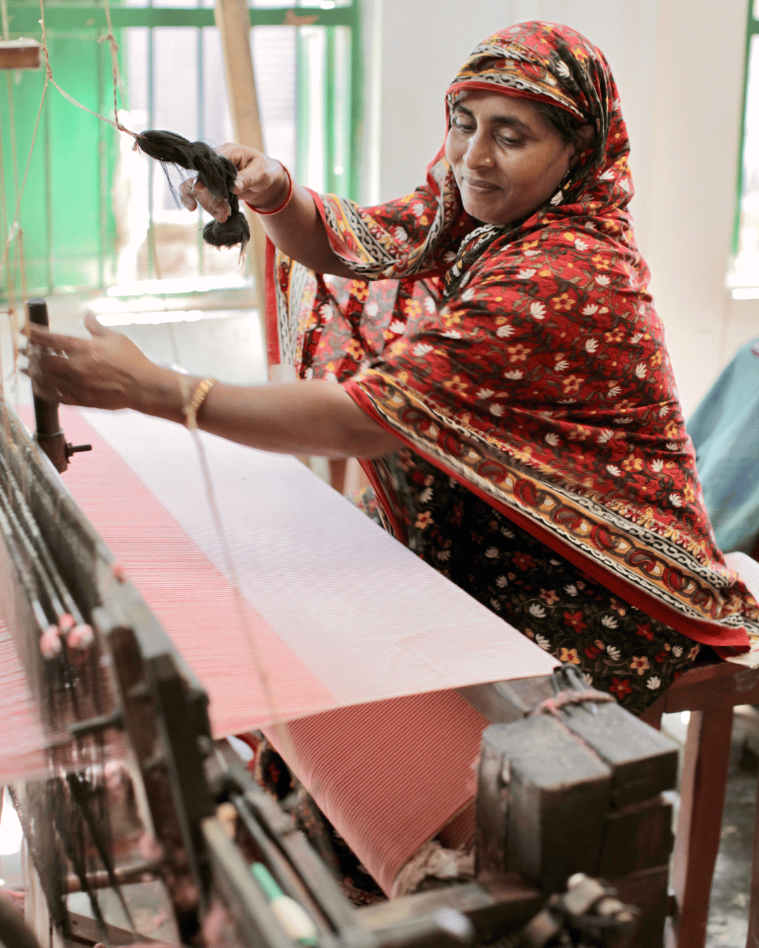 Our garments are handwoven and hand embroidered in a rural village in Bangladesh. The yarn that is dyed and processed is certified organic. When it reaches the village, it is carefully bobbined and put into hanks that can then be fed onto the hand looms, from there it is woven into cloth and stitched into garments.