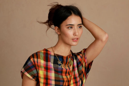 Slash Neck Top - Multi Check (Shorter Length)