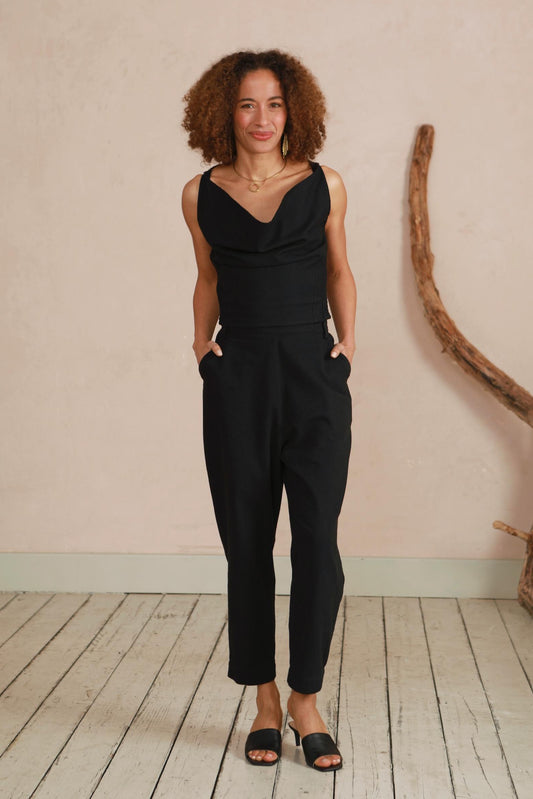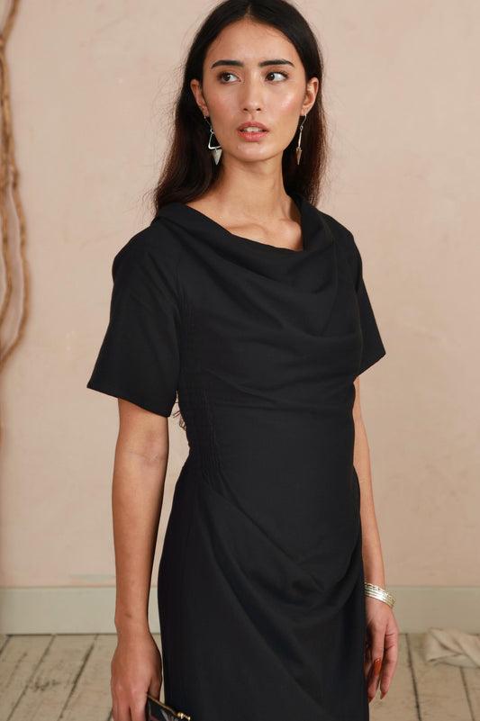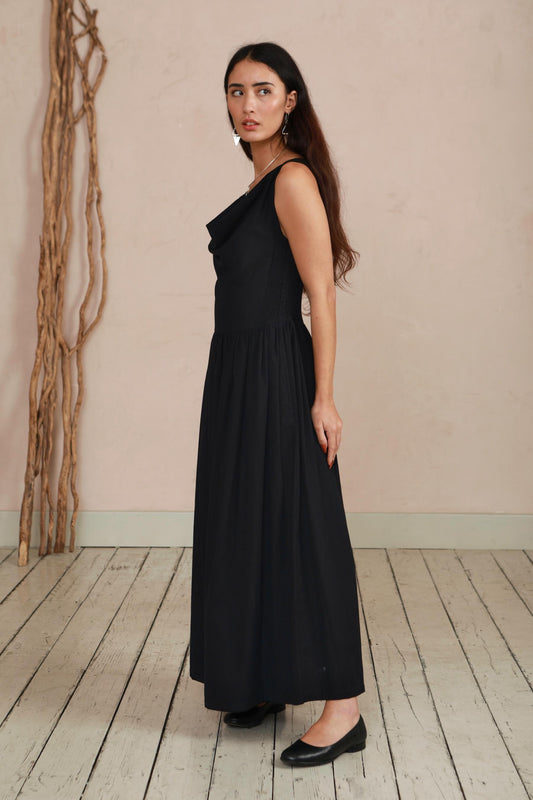 The Celia Cowl Neck Dress in Handwoven Organic Cotton - Black Twill