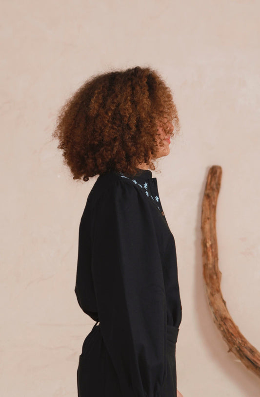 Beth Flower Blouse- Hand Embroidered - Black Twill