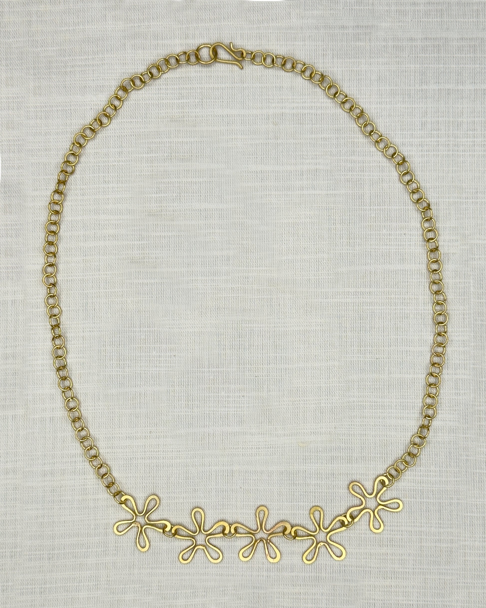 The Meadow Necklace brings simple elegance to any outfit. Featuring 5 hand-made flowers on an adjustable chain, this necklace is made by artisans at Bombolulu Workshops in Kenya, supporting inclusive employment and traditional craft skills.