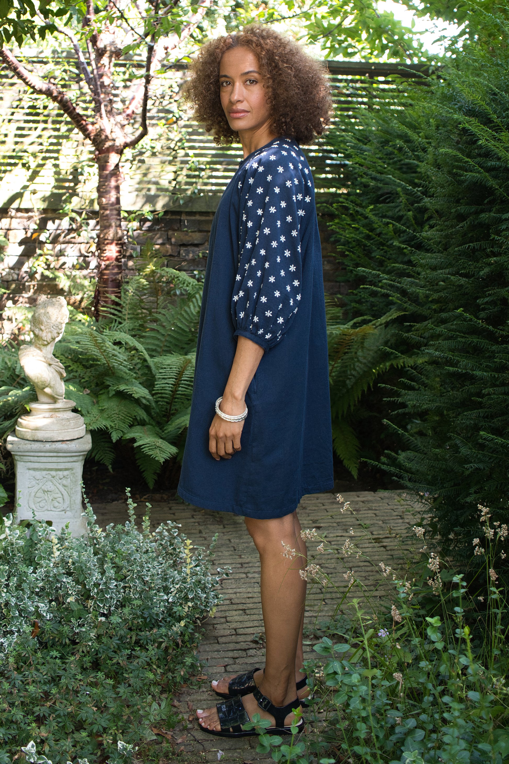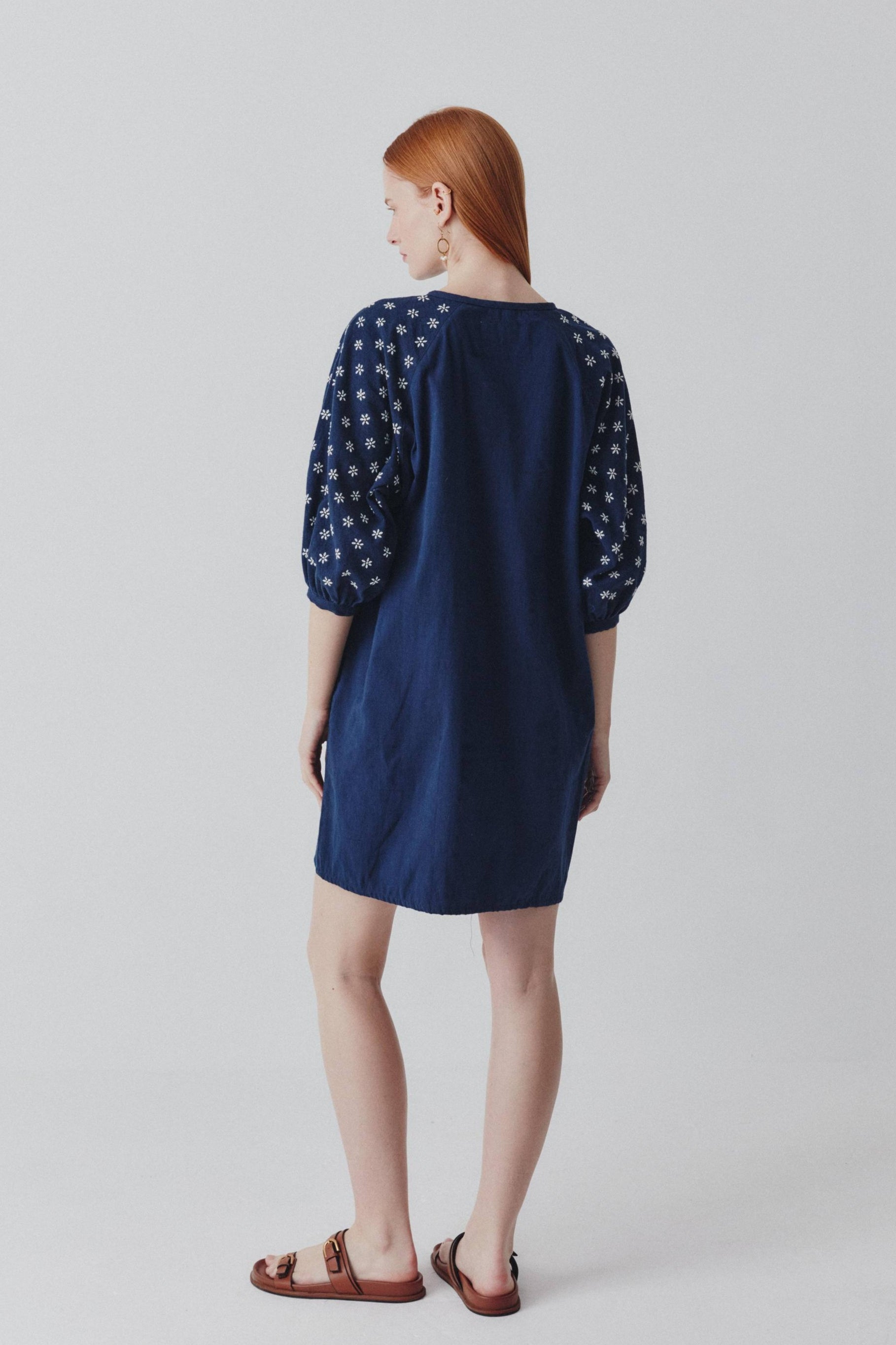 A modern take on effortless femininity, the Daisy Dress in Medium-Weight Dark Navy is a versatile piece with a thoughtful twist. Above-the-knee and structured in silhouette, this dress features a coconut shell button closure at the neckline and beautifully hand-embroidered white daisies along the sleeves — each one stitched by women artisans using traditional techniques.