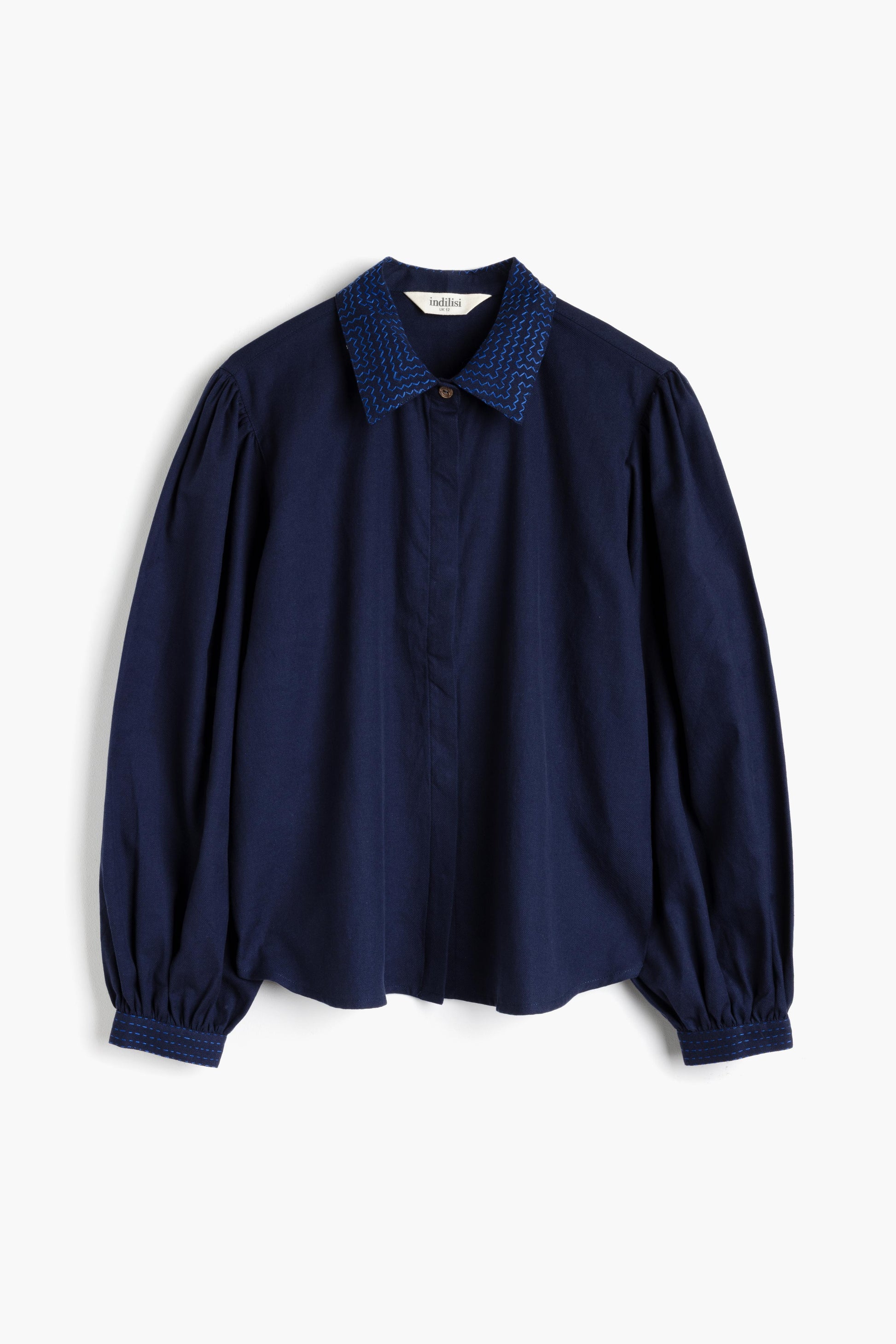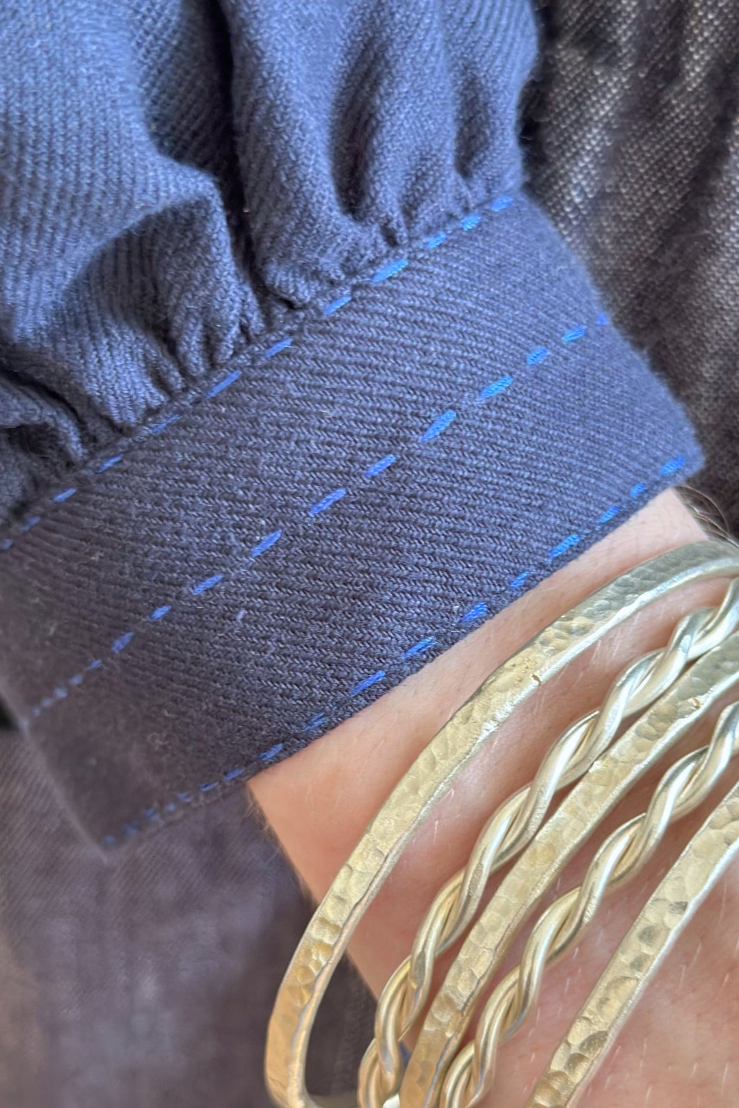 Handwoven in soft, breathable organic cotton, it showcases voluminous puff sleeves balanced by a gently structured silhouette. The Navy collar is hand-embroidered on the collar and cuffs, adding subtle artistry to a simple garment for those who like style with under-stated craft detailing. This will get noticed on a Zoom meeting or in the board room!