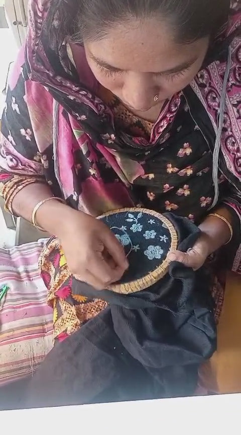 Every Yuka Yoke Dress starts with soft, handwoven organic cotton, brought to life by the skilled hands of artisans in Bangladesh. The delicate flowers are hand-embroidered with care, making each dress uniquely beautiful. Crafted with love and attention to detail, this dress not only supports traditional crafts and fair wages but is also made to last - so you can enjoy it season after season, while feeling good about the impact your wardrobe has on the planet.